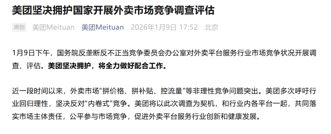 1月9日,国务院反垄断反不正当竞争委员会办公室宣布,对外卖平台服务行业市场竞争状况开展调查、评估。