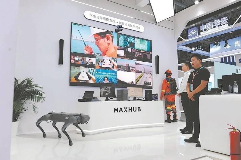 7月18日,由中国气象服务协会主办的首届气象经济博览会在合肥滨湖国际会展中心举办。展会聚焦气象新能源、低空经济、人工智能、气象科普文创等搭建气象产业供需交易平台,推动气象融入人民生产生活,赋能经济社会发展。图为工作人员展示气象应急调度方案。